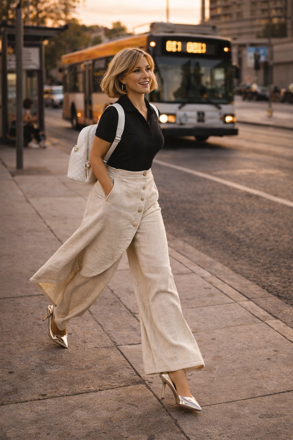 Il pannello sovrapposto introduce una linea fluida che ricorda il movimento di una gonna sofisticata, mantenendo la praticità del pantalone.