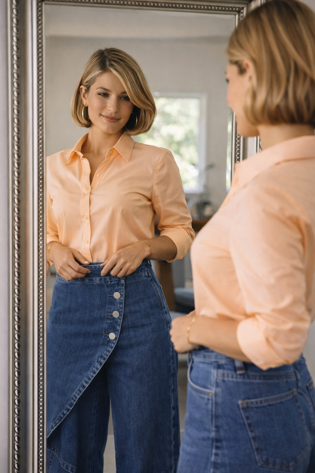 La struttura pulita e il design del pannello frontale permettono di abbinarlo facilmente a camicie, top, blazer o maglie essenziali, trasformandolo in un capo che può diventare rapidamente uno dei più versatili del guardaroba.